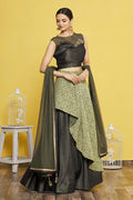 Olive Green Fancy Velvet Embroidered Stitched Lehenga Choli with Dupatta