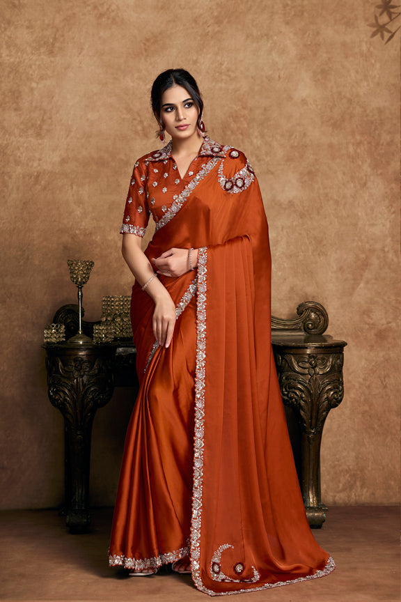 Rust Lustrous Satin Silk Sequins Embroidery Saree