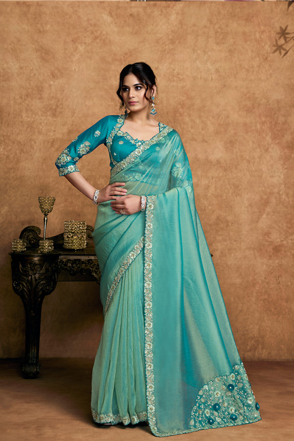 Pista Green Two Tone Satin Silk Stone Handwork Ready to Wear Saree