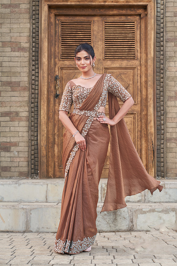 Brown Two Tone Satin Silk Pearl Work Ready to wear saree