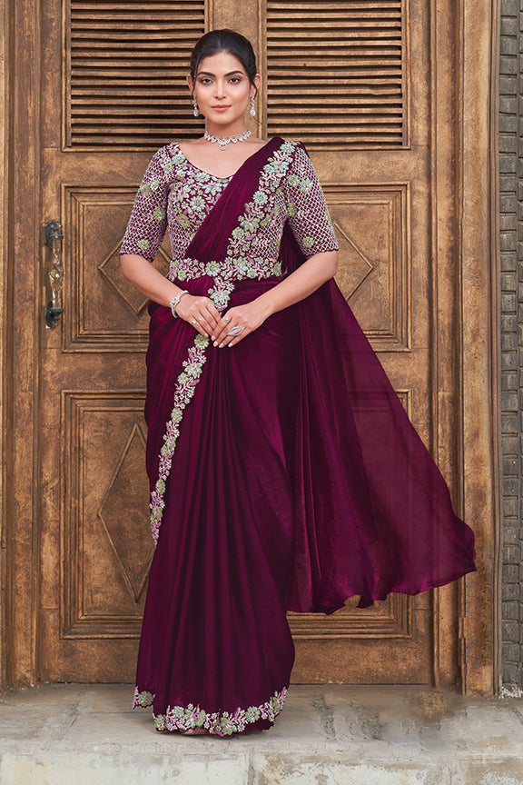 Wine Two Tone Satin Silk Hand Work Ready to wear saree