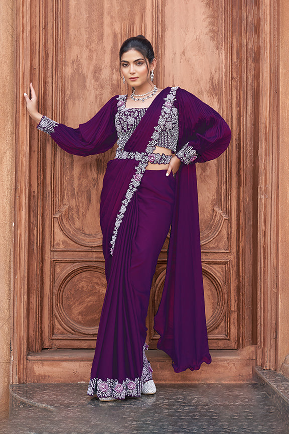 Purple Crepe Satin Silk Hand Work Ready to wear saree