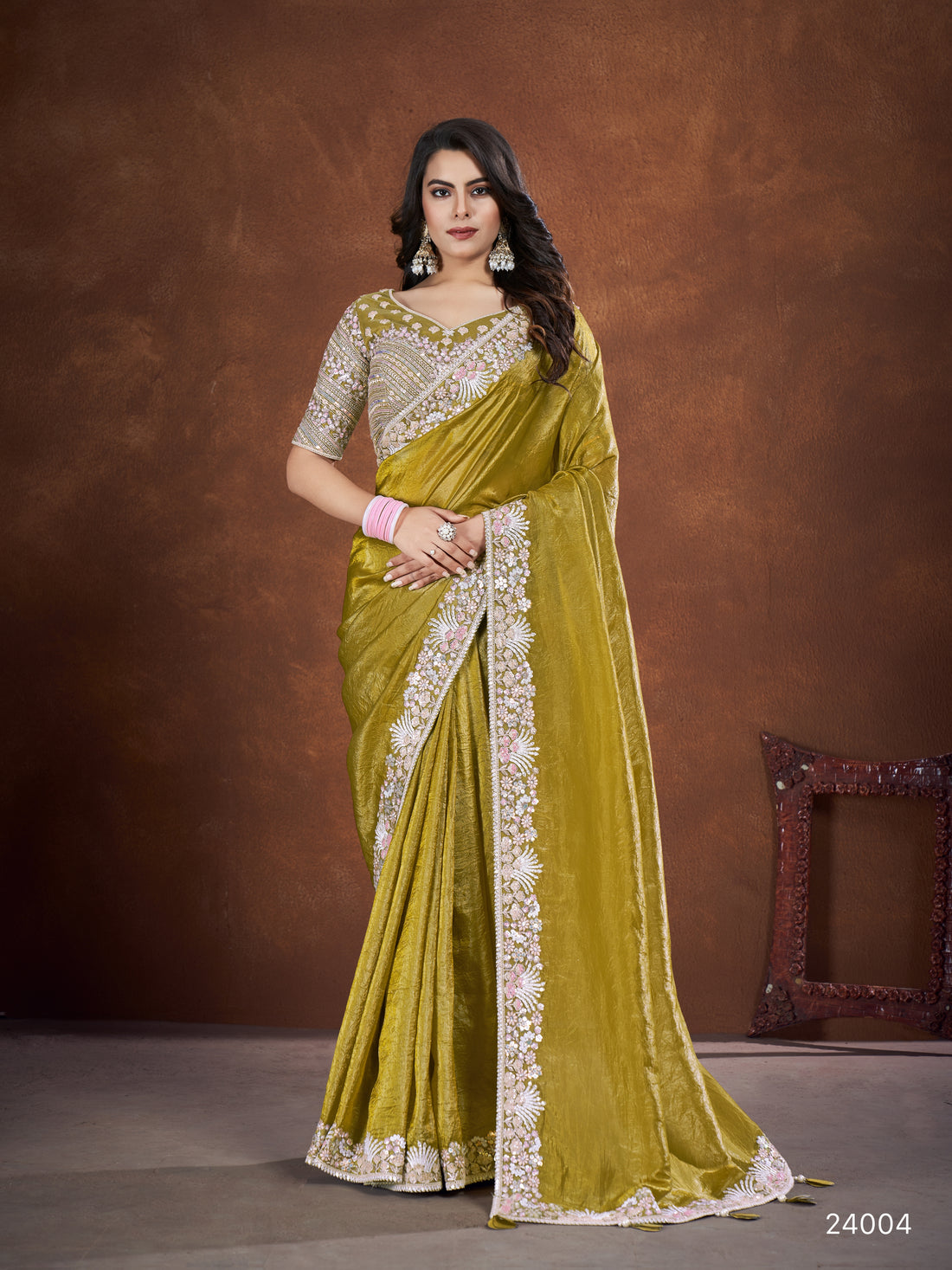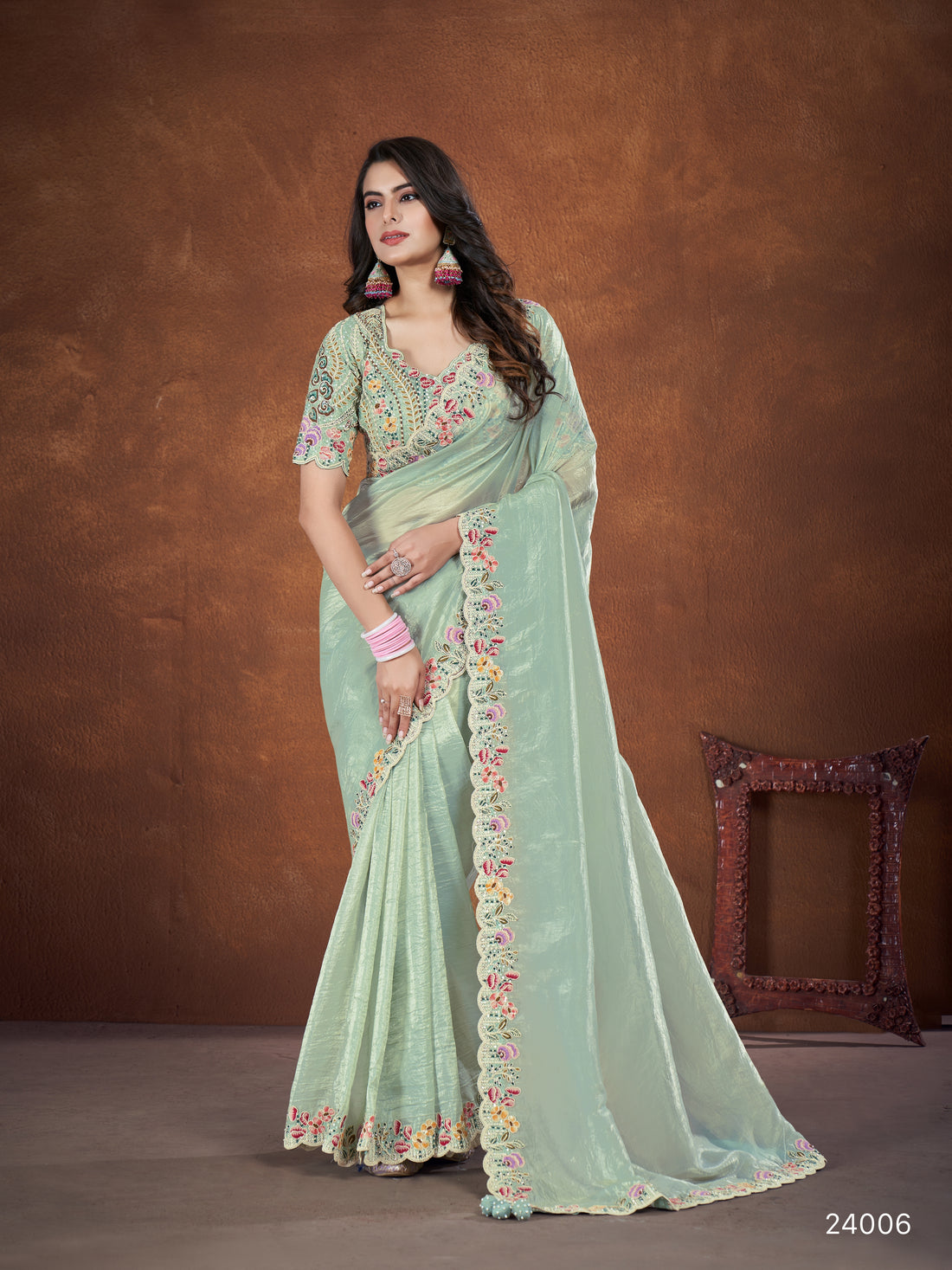 Green Banarasi Crush Silk Embroidered Saree with stitched Blouse