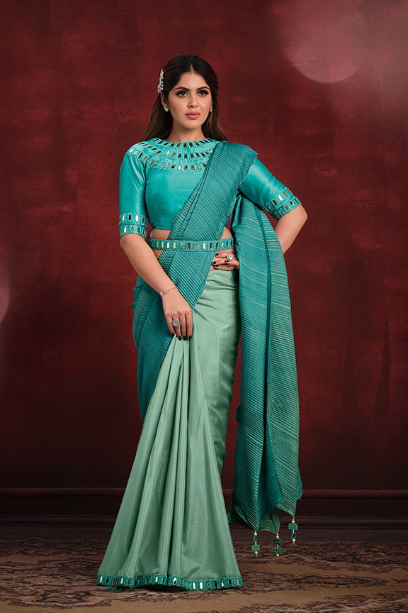 Blue Satin Silk Ready to Wear Designer Saree with Stitched Blouse