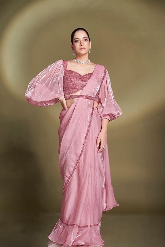 Pink Two Tone Satin Silk Sequins Ready to Wear Saree