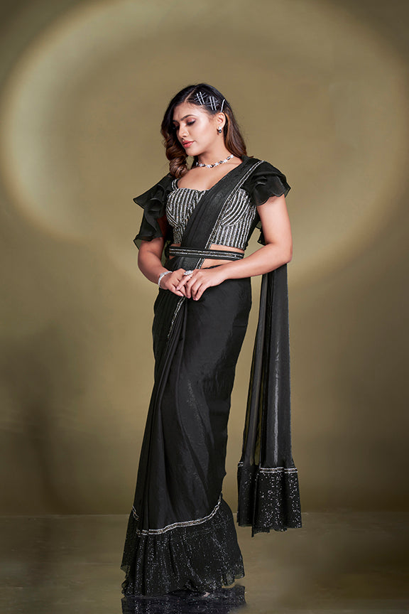 Black Two Tone Satin Silk Sequins Ready to Wear Saree