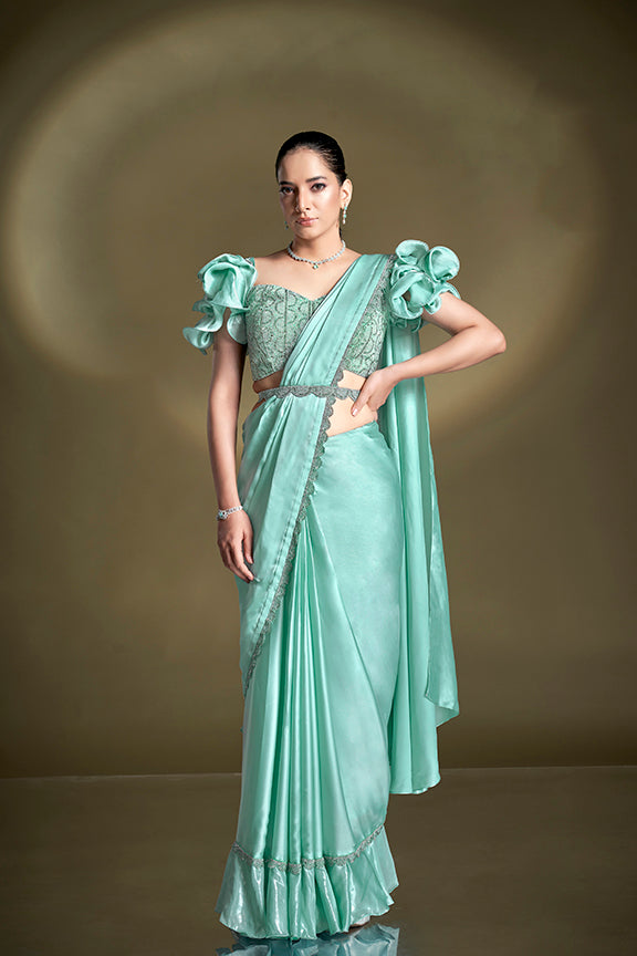 Sea Green Crepe Satin Silk Sequins Ready to Wear Saree