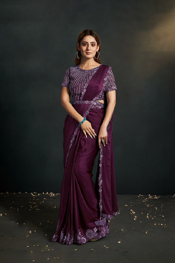 Purple Mirror Work Satin Silk Ready to Wear Saree