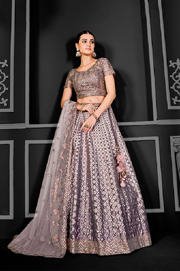 Grey Net Embroidered Semi Stitched Lehenga Choli