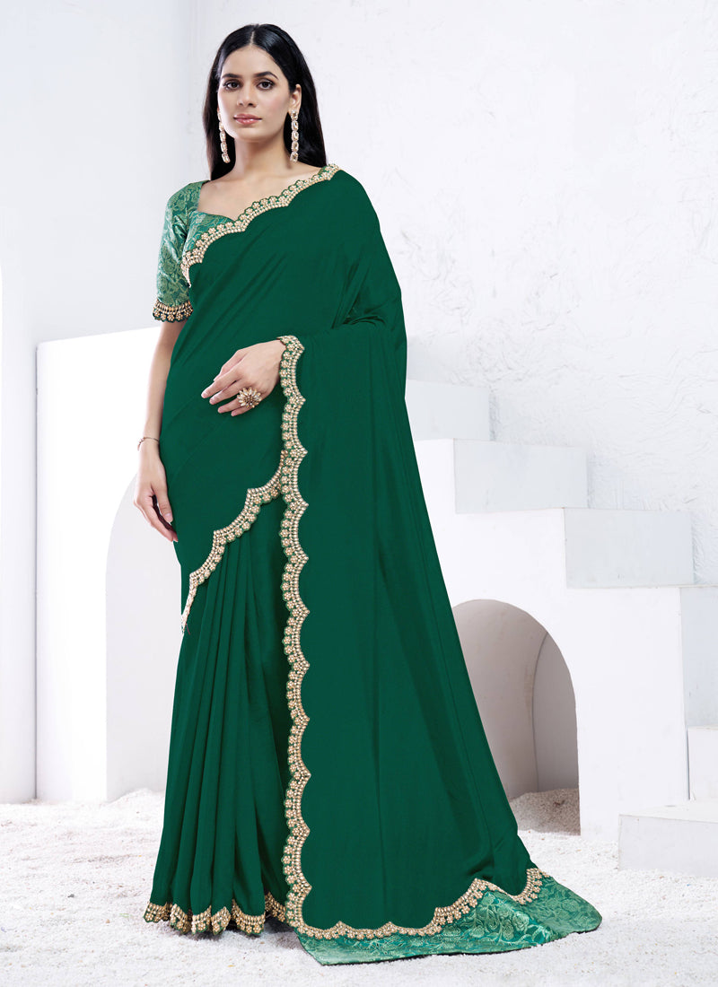 Green Banarasi Crush Silk Embroidered Saree with Unstitched Blouse