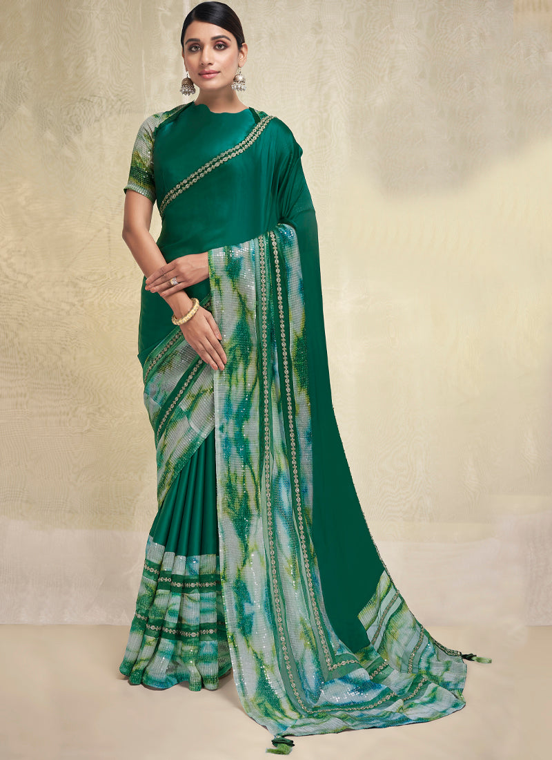 Saree Fabric : Chiffon Satin Silk Blouse Fabric: Chiffon Satin Silk Color : Green Work: Silver Sequence,...