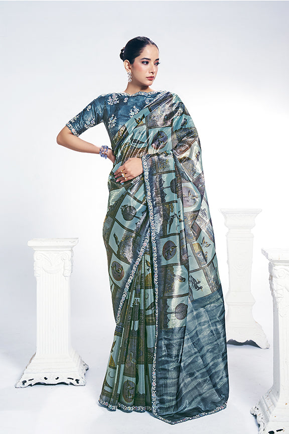 Blue Two Tone Paper Silk Stone Handwork Saree