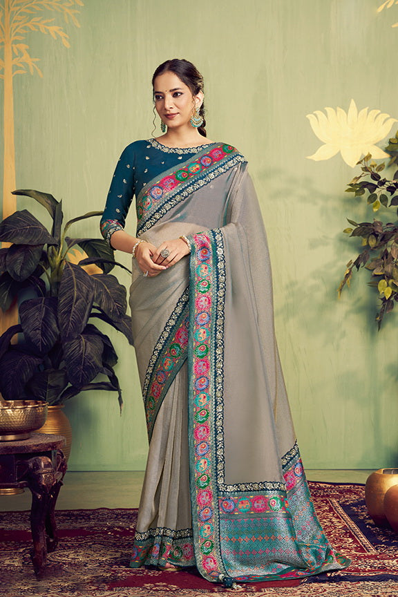 Silver Zari Woven Tissue Silk Sequence Embroidery Saree