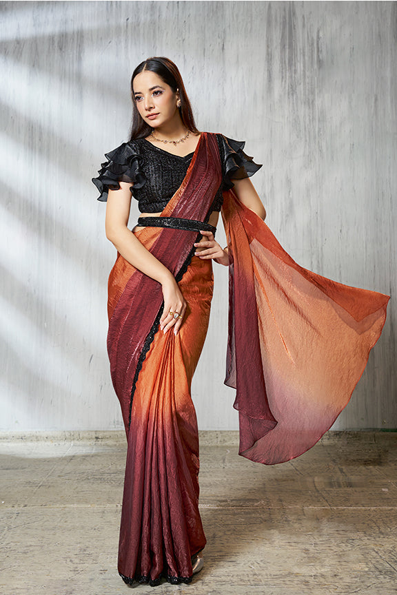 Rust Two Tone Satin Silk Beads Ready to Wear Saree