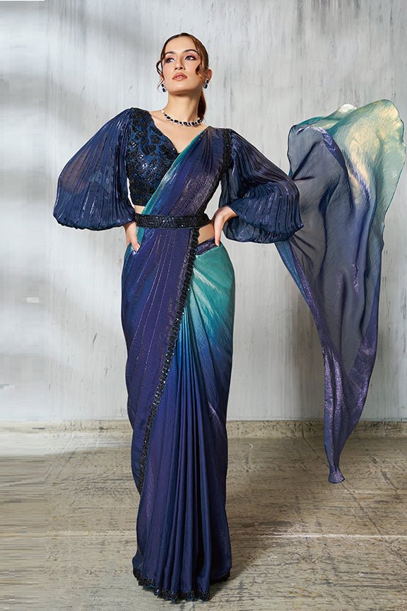 Blue Two Tone Satin Silk Beads Ready to Wear Saree