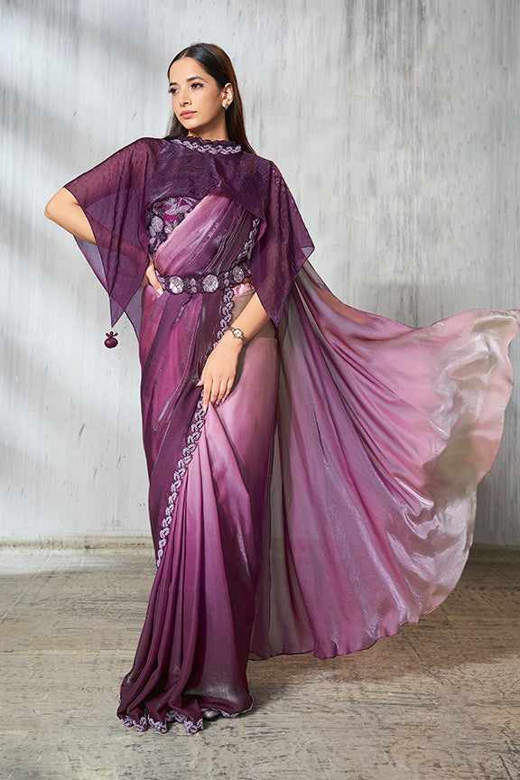 Wine Two Tone Satin Silk Beads Ready to Wear Saree