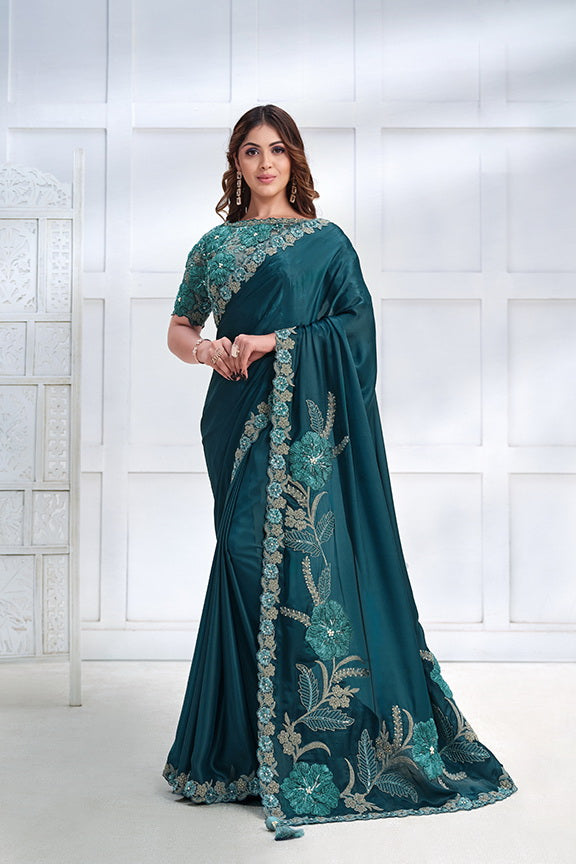 Teal Crepe Satin Silk Embroidered Saree with Unstitched Blouse