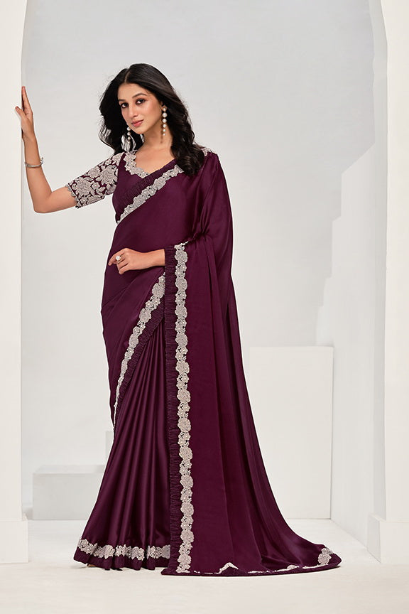 Wine Crepe Satin Silk Handwork Saree with Unstitched Blouse Piece