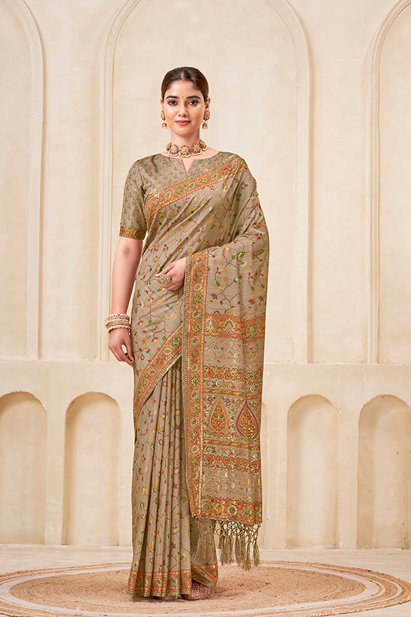 Chiku Tussar Silk Jacquard Abstract Digital Print Saree