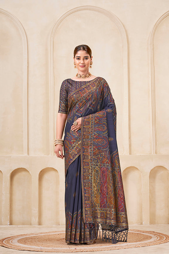 Blue Poly Kundan Traditional Digital print with Foil Print Saree