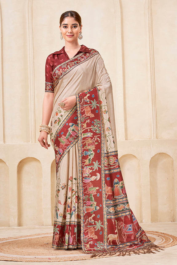 Cream Sambalpuri silk Traditional Digital print with Foil Print Saree