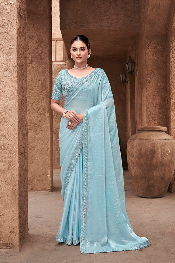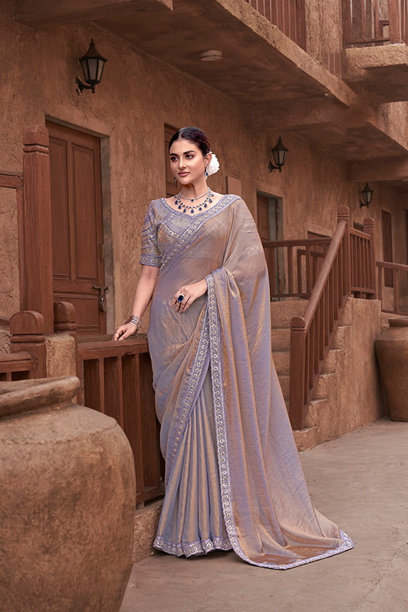 Firoji Gradient Satin Silk Artisanal Hand Embroidery Work Designer Saree with Stitched Blouse.