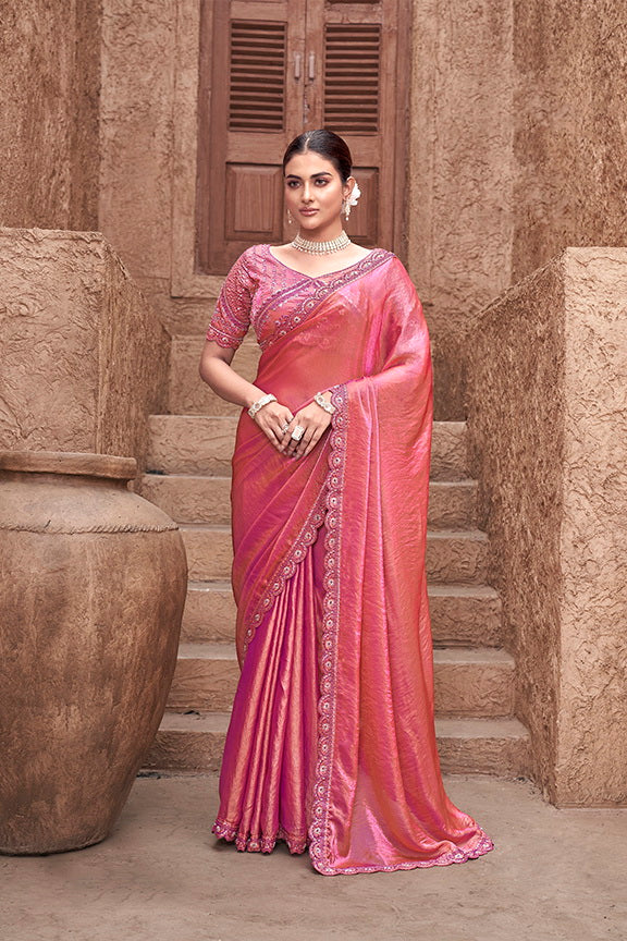 Pink Gradient Satin Silk Artisanal Hand Embroidery Work Designer Saree with Stitched Blouse.