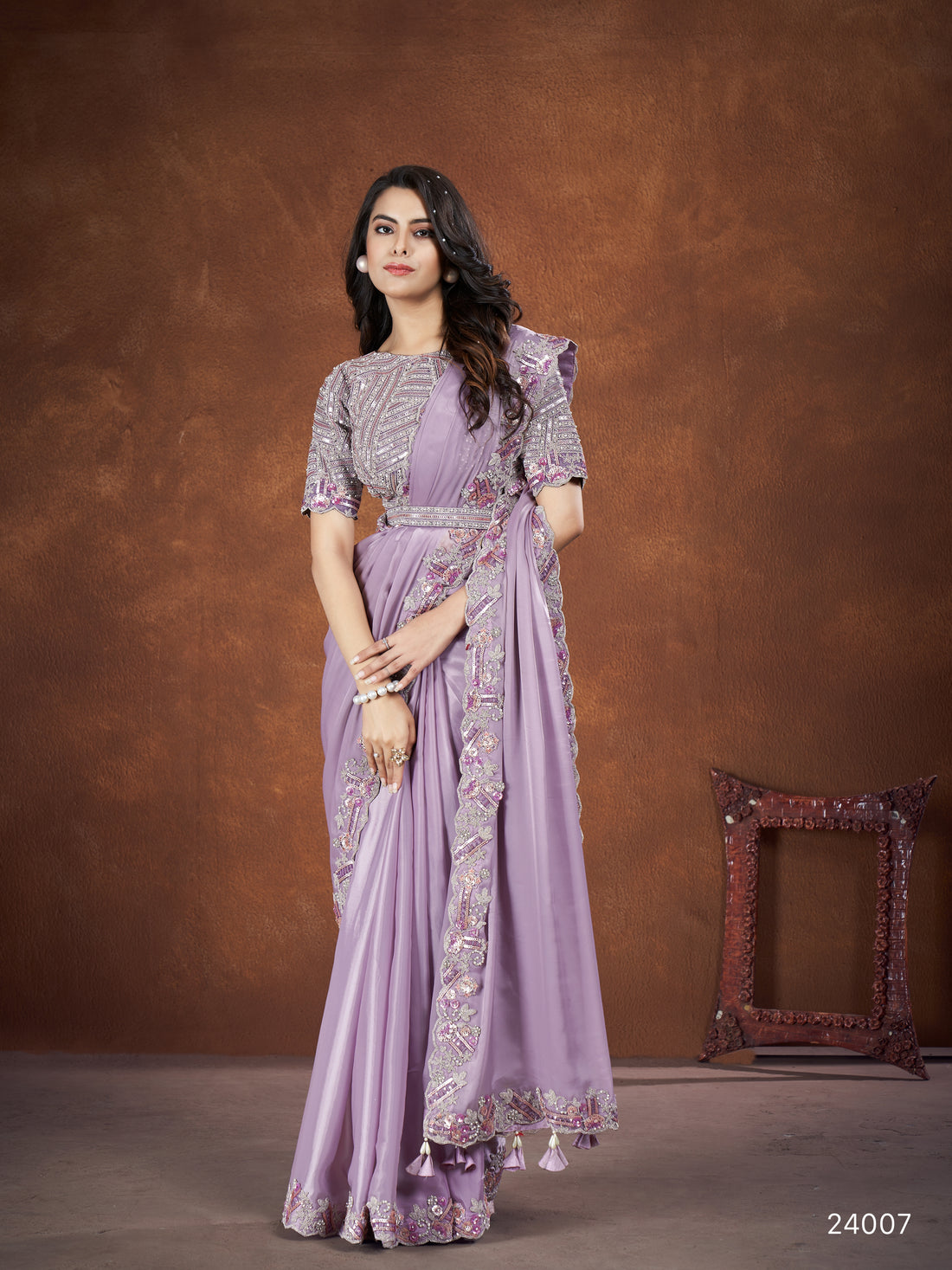 Lavendar Crepe Satin Silk Embroidered Saree with stitched Blouse