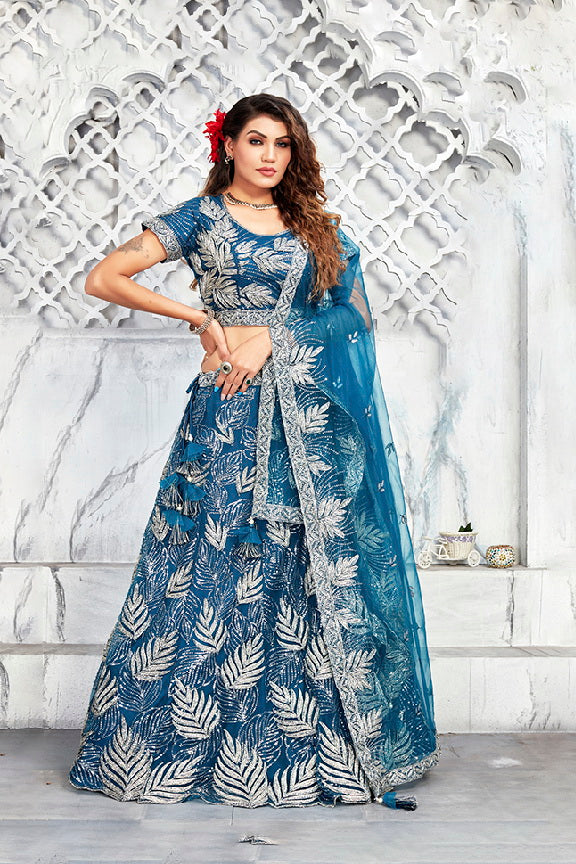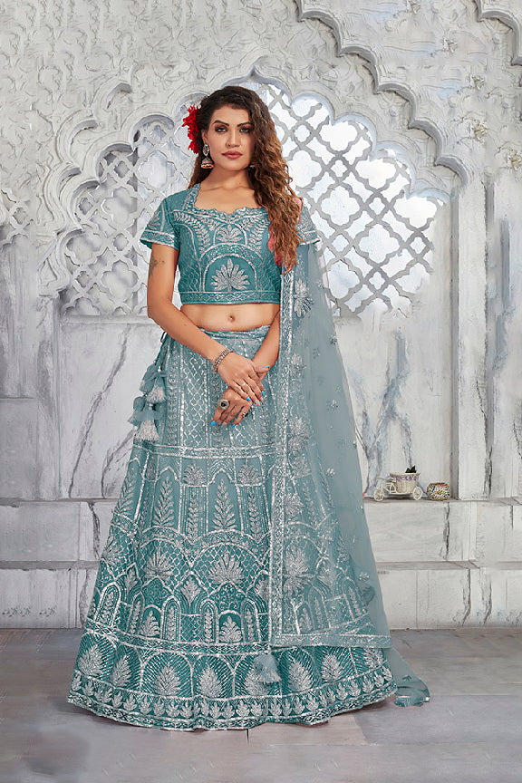 Teal Net Silk Unstitched Lehenga Choli with Dupatta