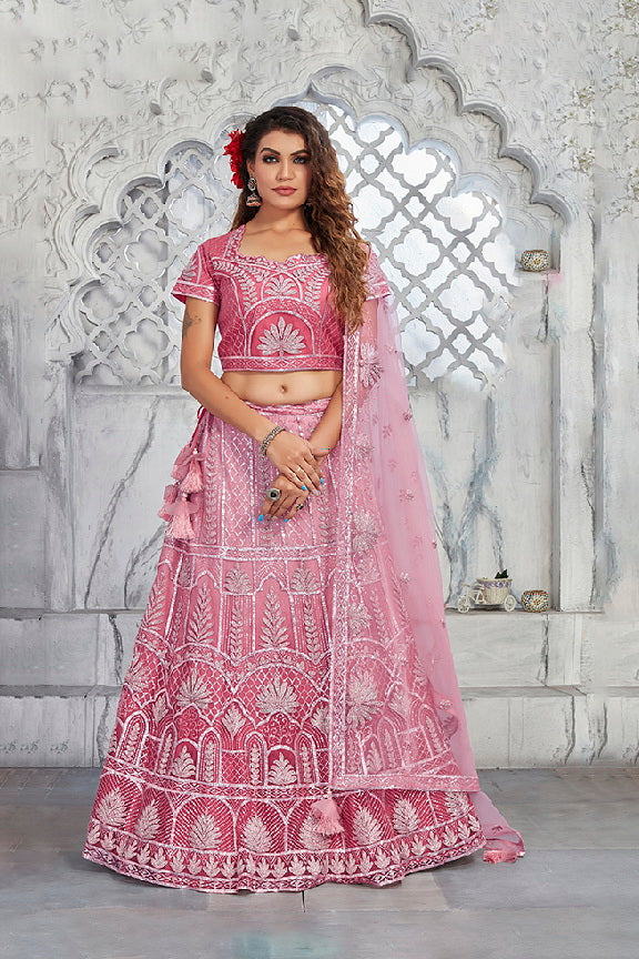 Pink Net Unstitched Lehenga Choli with Dupatta