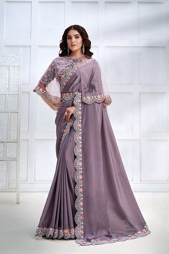 Lavendar Crepe Satin Silk Embroidered Saree
