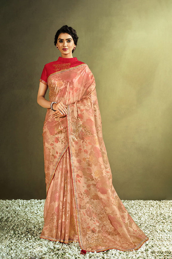 Saree Fabric : Tissue Blouse Fabric: Raw Silk Color : Peach Work: Digital Printed Flowers. Stone...