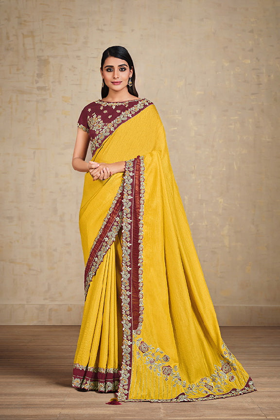 Yellow Silk Georgette Embroidered Saree With Unstitched Blouse