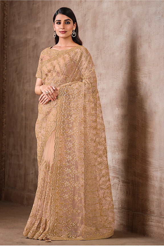 Saree Fabric : Net Blouse Fabric: Weaved Zari Silk Color : Peach Work: Resham and...