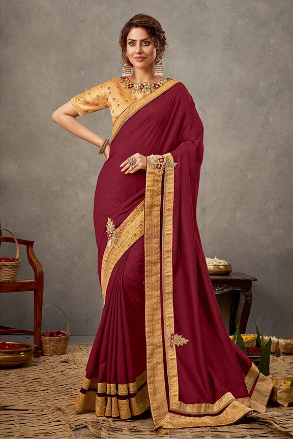 Saree Fabric: Satin Silk Blouse Fabric: Raw Silk Color: Purple Work: Embroidery Border with Cut-work ...