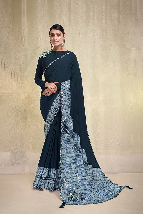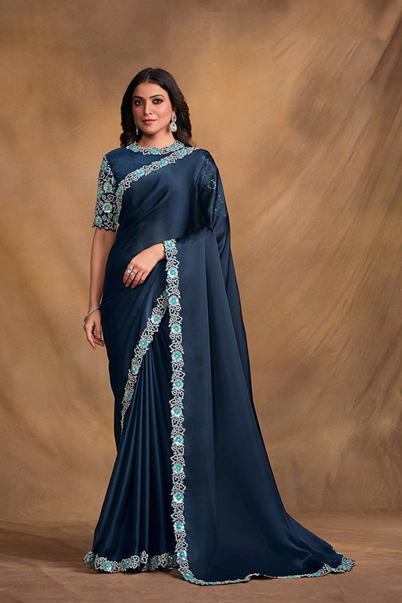 Blue Satin Silk Georgette Saree with Unstitched Blouse