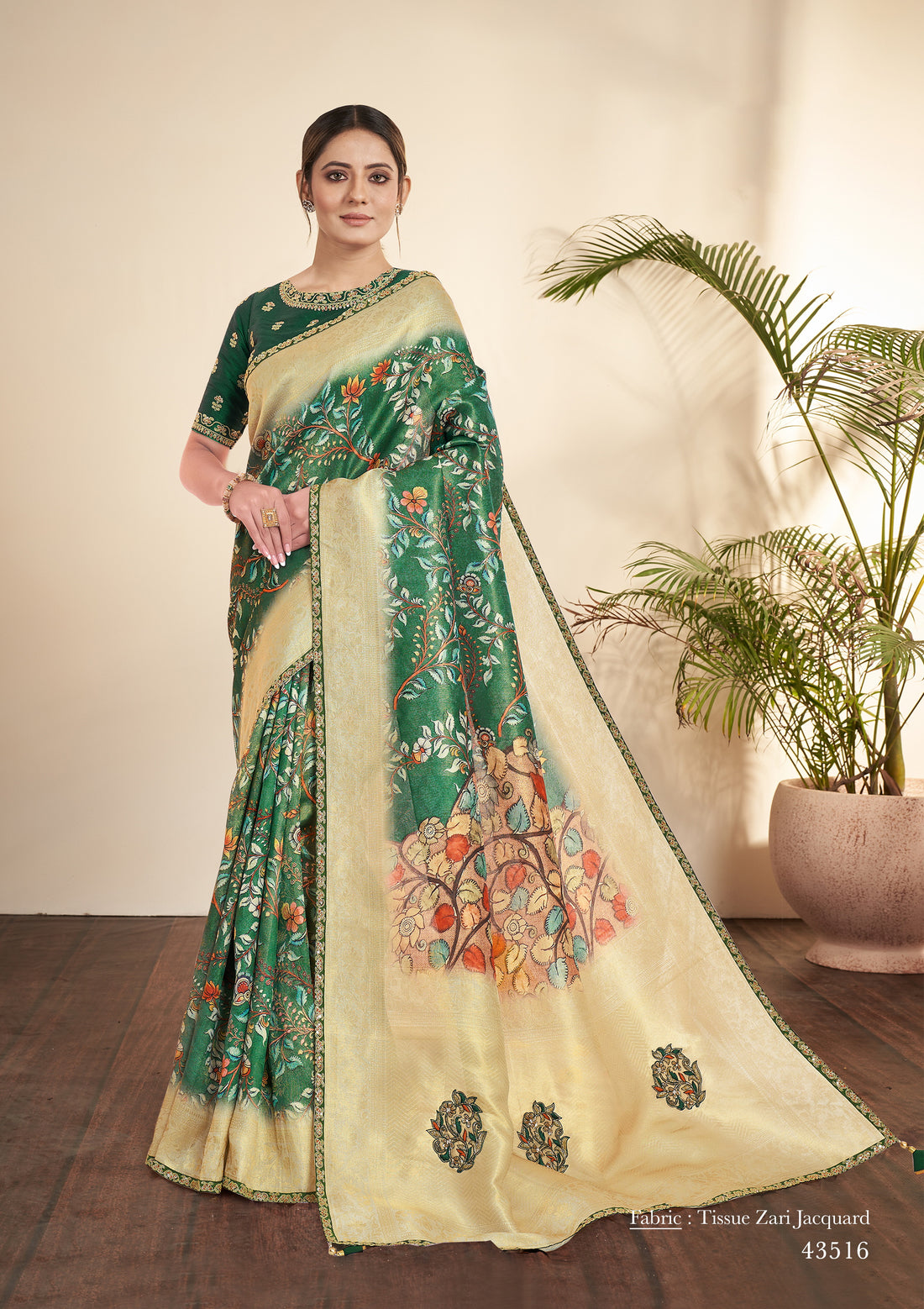 Green Tissue Floral Printed Saree with Unstitched Blouse