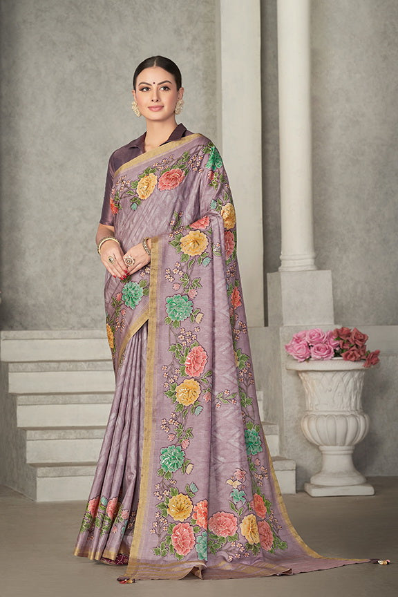 Saree Fabric : Rangkat Tussar Silk Blouse Fabric: Malai Satin Color : Purple Work: Floral,...