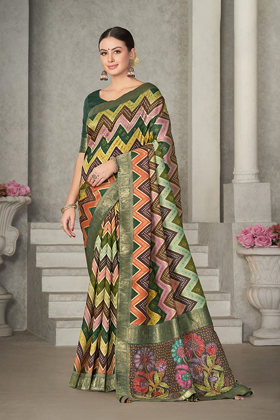 Saree Fabric : Rangkat Tussar Silk Blouse Fabric: Brocade Color : Green Work: Floral Print,...