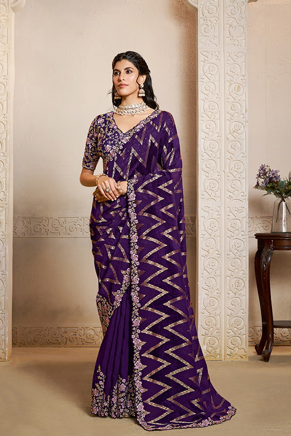 Purple Pure Jacquard Velvet Silk Handwork Designer Saree