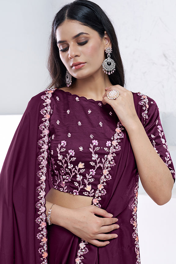 Wine Crepe Satin Silk Dual Sequence with moti work Saree