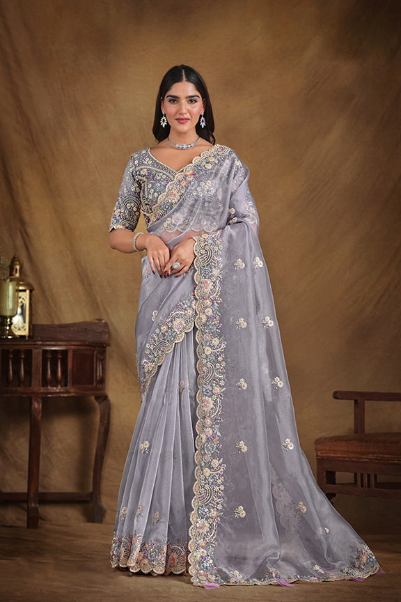 Saree Fabric : Pure Organza Silk Blouse Fabric: Malai Satin Color : Grey Work: Multi...