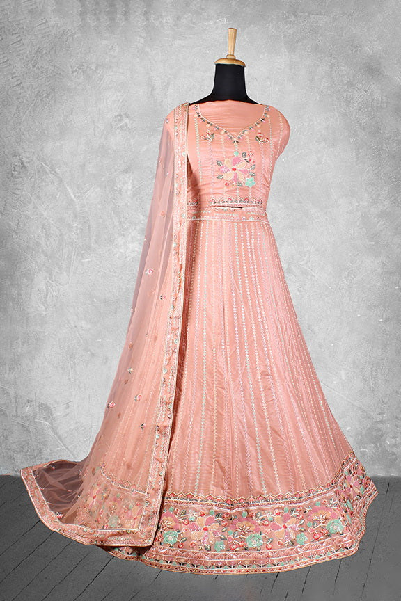 Peach Net Embroidered Semi Stitched Lehenga Choli with Dupatta