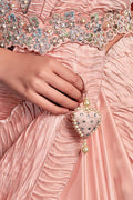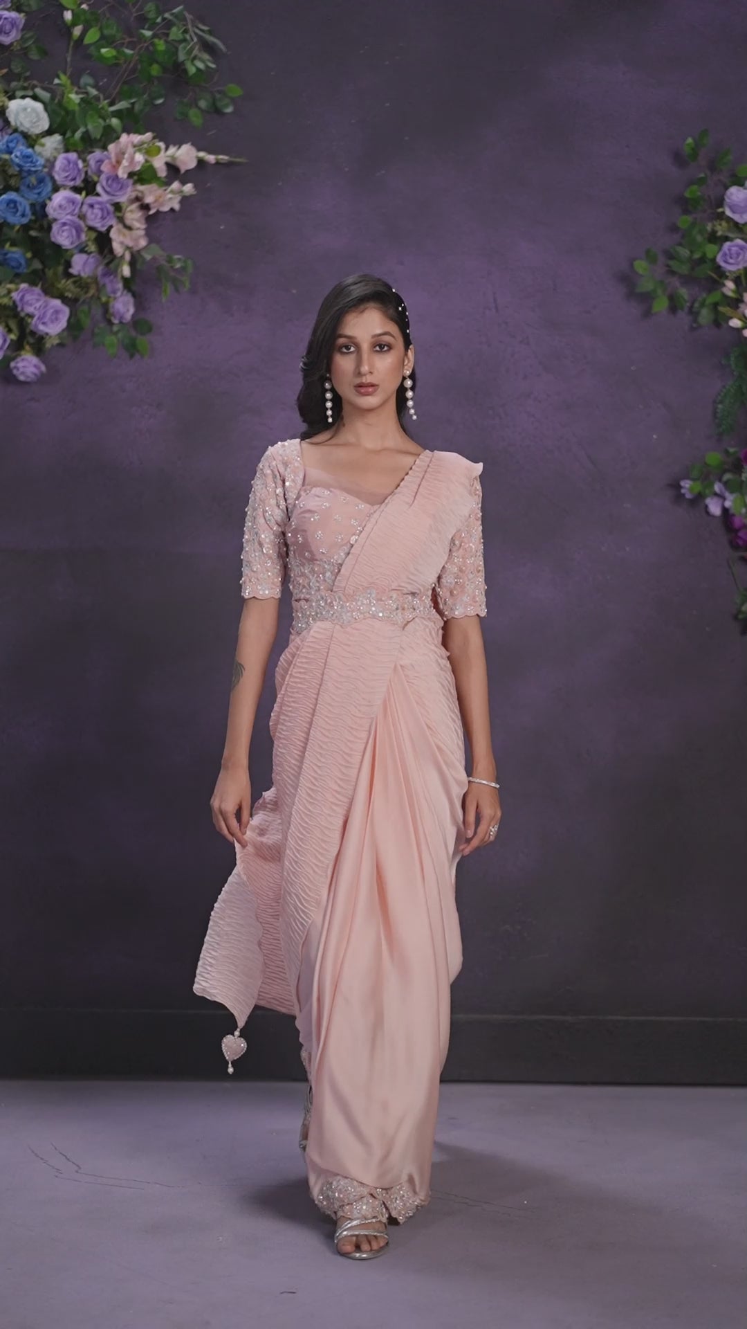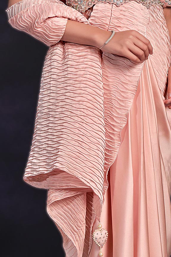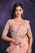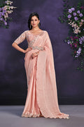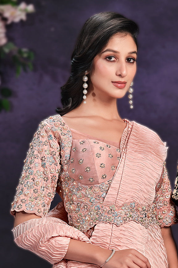 Peach Crepe Satin Silk Embroidered Ready to Wear Saree with Stitched Blouse