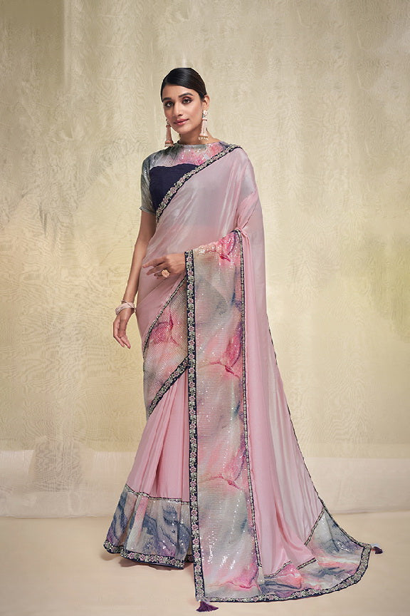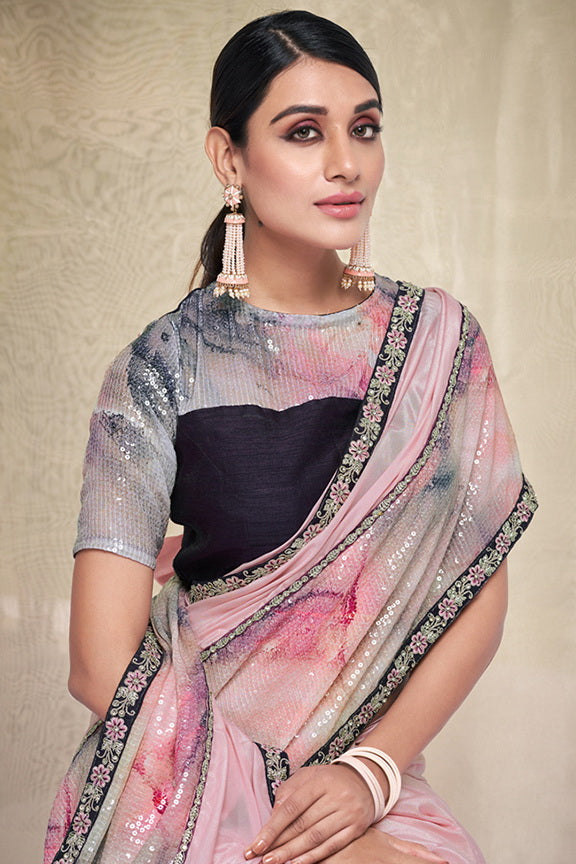 Light Pink Crepe Silk Georgette Embroidered Saree With Unstitched Blouse
