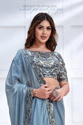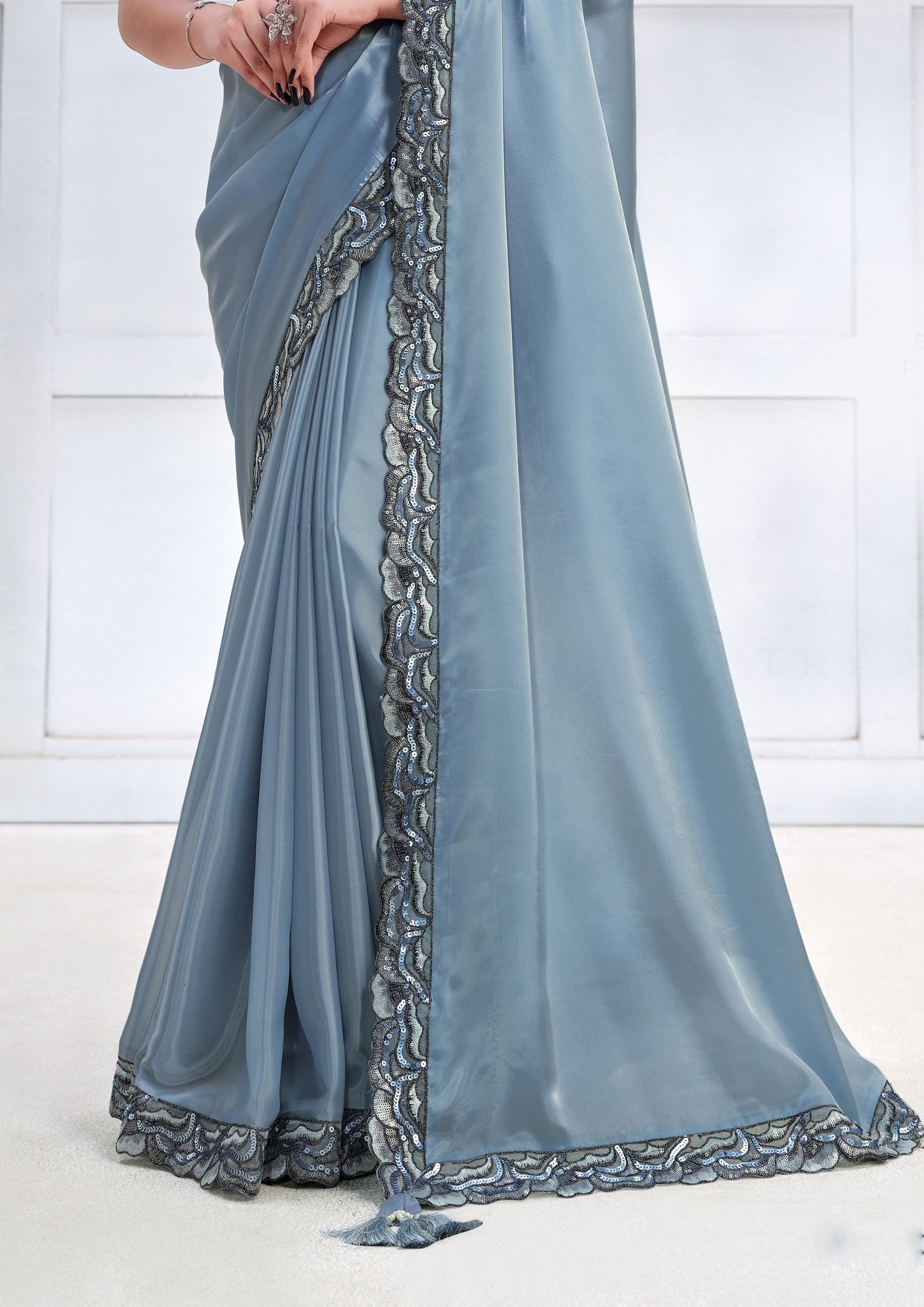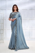 Blue Crepe Satin Silk Embroidered Saree with Unstitched Blouse