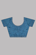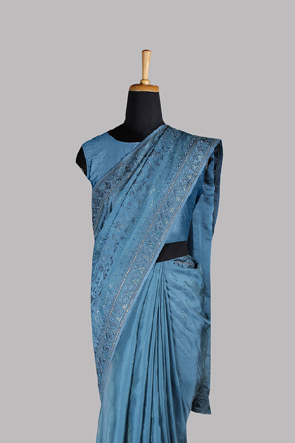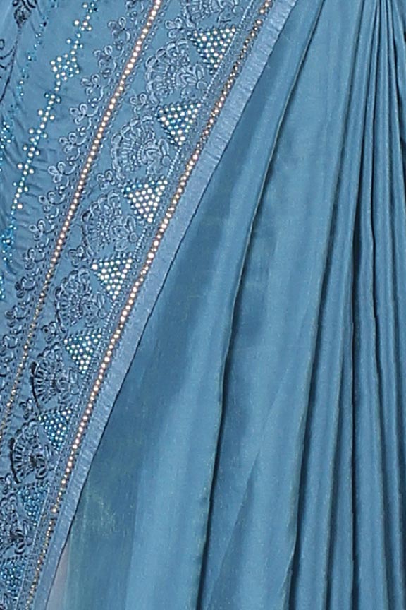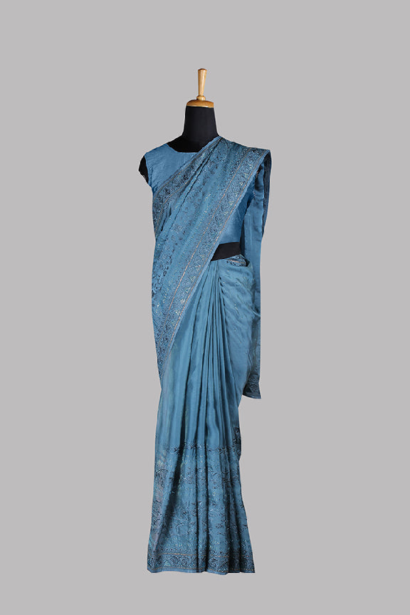 Blue Organza Satin Silk Thread work Saree with Unstitched Blouse