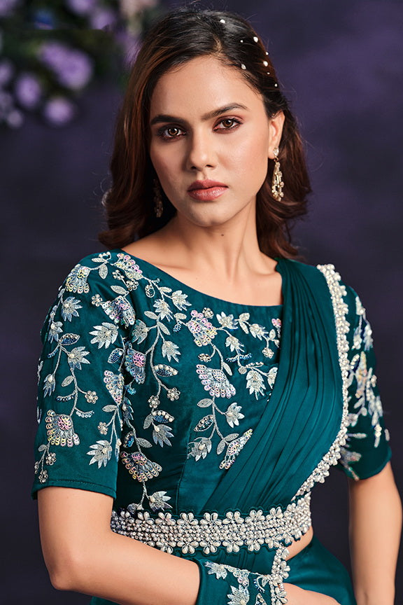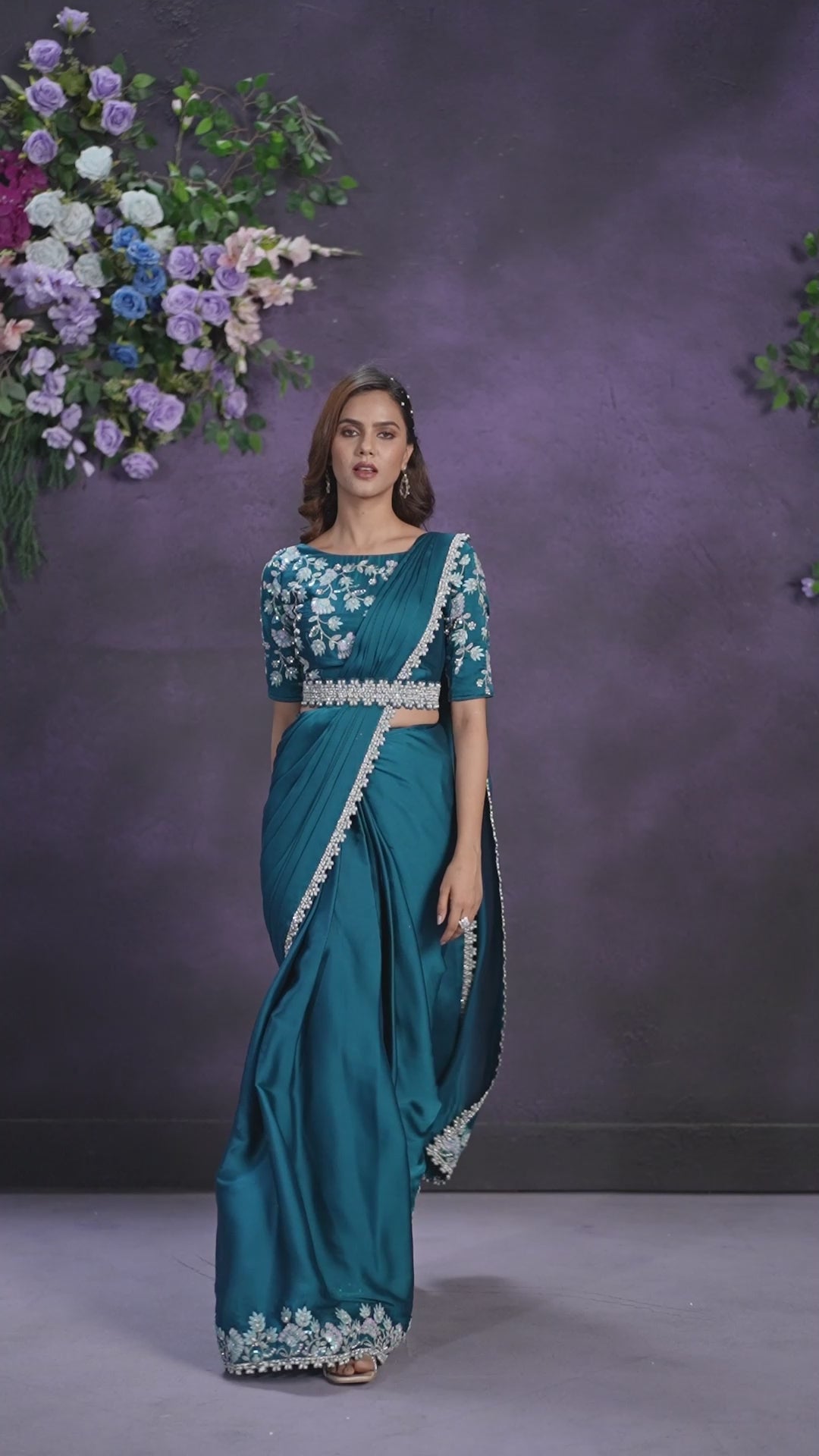 Turquoise Blue Crape Satin Silk Embroidered Ready to Wear Saree with Stitched Blouse