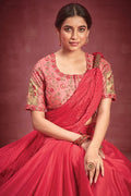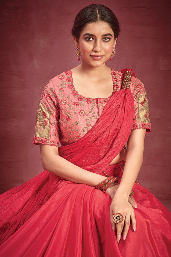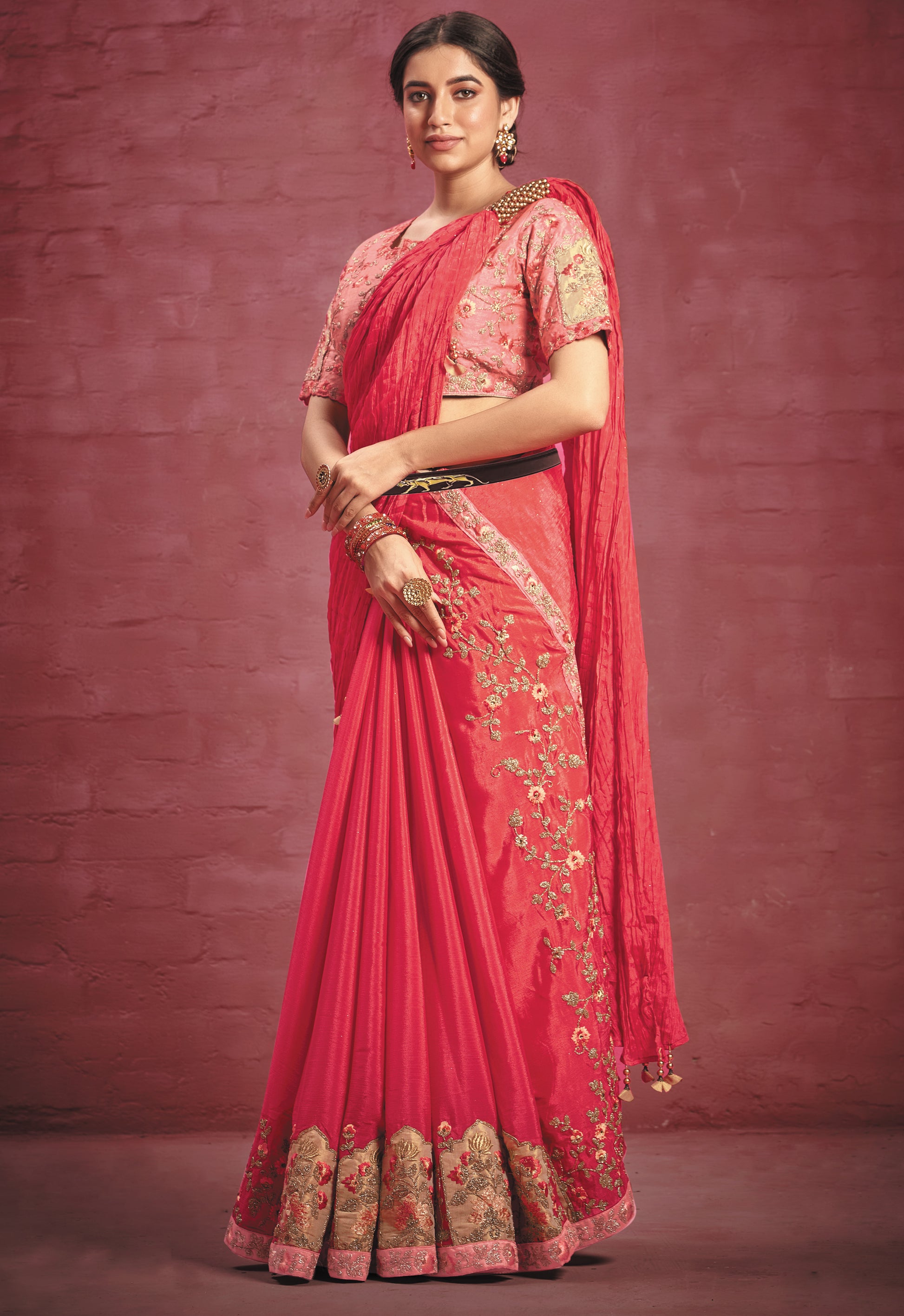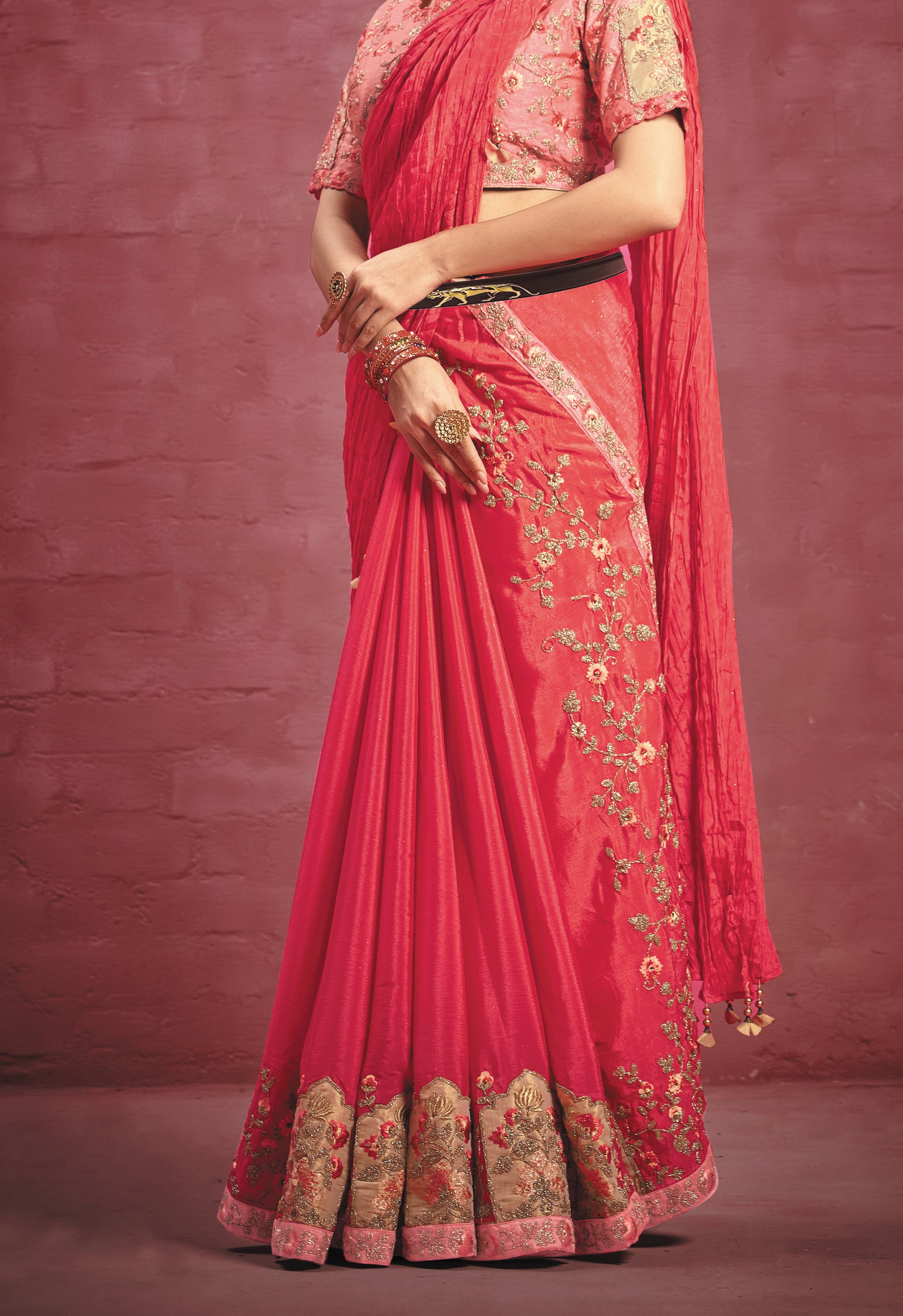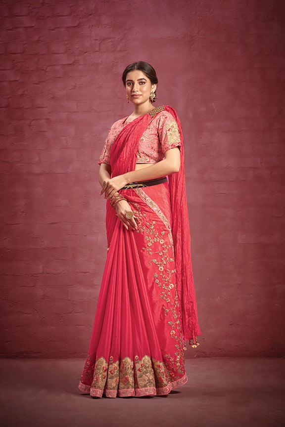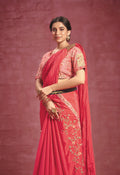 Pink Silk Crepe Embroidered Ready to Wear Saree with Stitched Blouse