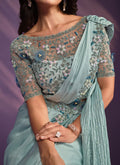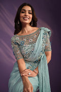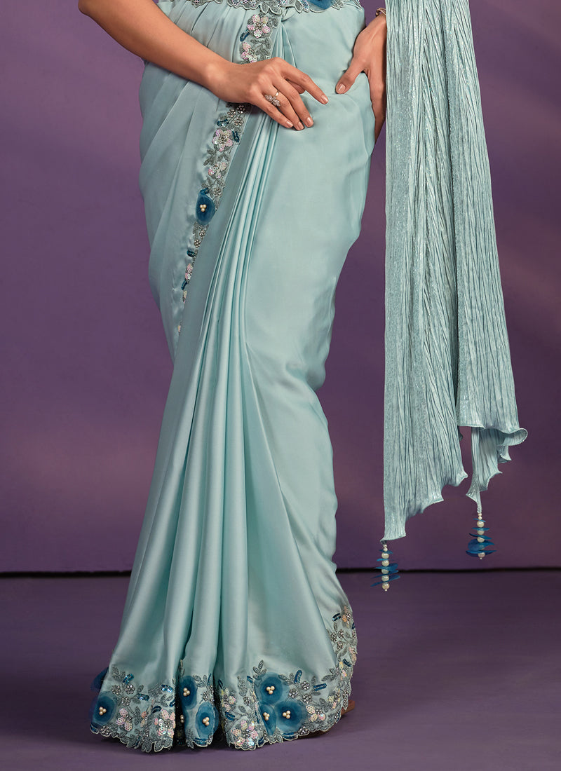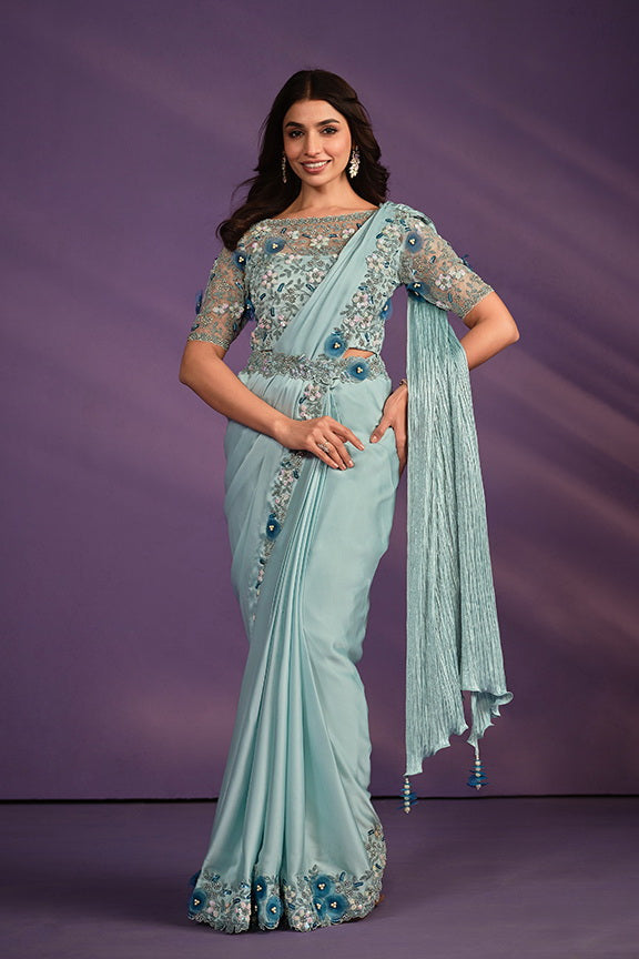 Green Crepe Satin Silk Embroidered Ready to wear Saree with Stitched Blouse